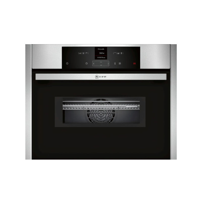 Display TFT standard a 2,5 colori con testo in chiaro e controllo NeffNavigator Pannello di controllo retroilluminato Cavità interna in nero diamante Volume 45 l 6 modalità di cottura: Circotherm®, grill grande, grill piccolo, grill ventilato, preriscaldamento, Circotherm® Eco 14 programmi automatici Regolazione della temperatura: 30 ° C - 275 ° C 5 potenze microonde (90 W, 180 W, 360 W, 600 W, 1000 W) con sistema innowave Raccomandazione di temperatura Visualizzazione della temperatura Controllo ottico dell'aumento di temperatura Easy-Clock: programmatore elettronico Preriscaldamento veloce Illuminazione a LED Sicurezza dei bambini Cavo di collegamento: 120 cm Assorbimento totale: 3,65 kW