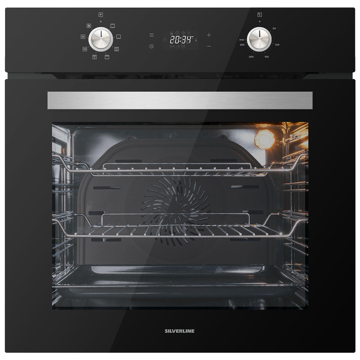 Forno multifunzione, 8 funzioni, 2 manopole push pull, timer digitale, blocco sicurezza, pre-riscaldamento rapido, guide laterali removibili, grill, termostato, ventola turbo, ventilazione tangenziale di raffreddamento, 2 griglie, 1 vassoio, pannello posteriore autopulente, pulizia a vapore, cottura 3D