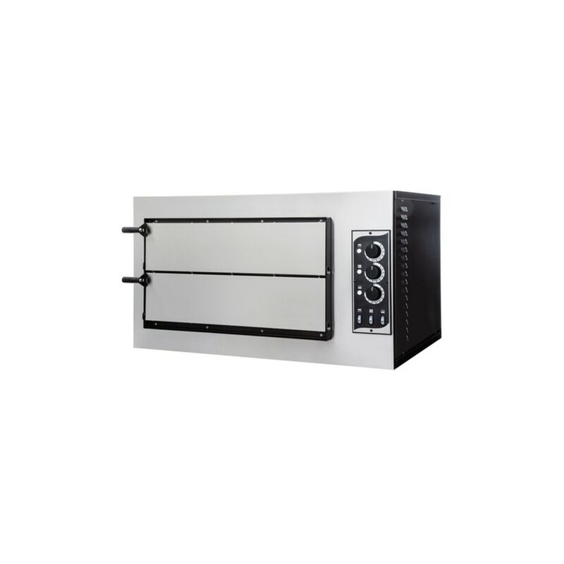 Codice RS2909 - Forno pizza elettrico modello PF-BASIC 2/50 a 2 bocche, dimensioni cm. 91.5x69x53 (lxpxh), dimensioni camera cm. 62x50x12 (lxpxh), 400 volt, 7.5 kw, temperatura d'esercizio 50-500 °C. Costruito in acciaio inox e in lamiera preverniciata. Piano di cottura in mattoni refrattari. Isolamento in lana di roccia evaporata. Resistenze corazzate.