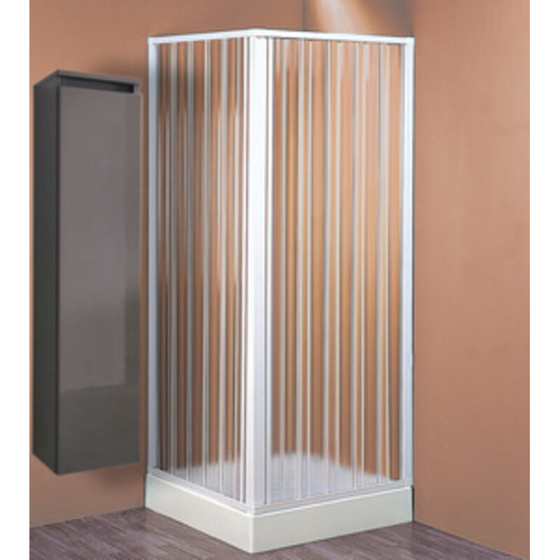 Cabina doccia modello 2 lati in kit ad angolo realizzato in resina anticalcare (cloruro di polivinile).Apertura angolare a soffietto da 85 cm con chiusura magnetica. Viteria in acciaio inossidabile. Sistema di scorrimento acqua direttamente nel piatto doccia (brevettato). Binario metrato per una facile riduzione di larghezza. Estensibilita' 60/80 x 60/80 cm. Altezza 185 cm. Colore profili bianco.