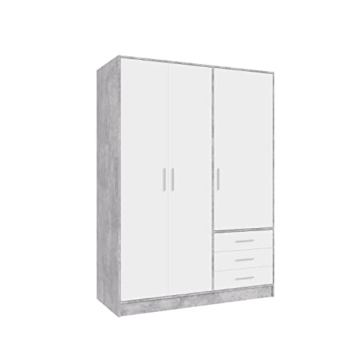 Forte Jupiter Armadio a 3 Ante, 3 cassetti, in Legno derivato, Finitura Effetto Cemento Grigio Chiaro e Bianco, 144,6 x 60 x 200 cm