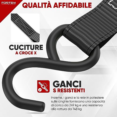 Durevoli e resistenti - Le impugnature in acciaio inossidabile rivestite in gomma presentano una chiusura a gancio liscia e facile da usare. I ganci a S sono rivestiti, assicurando una maggiore resistenza agli agenti atmosferici. Con una fettuccia in poliestere verde ad alta visibilità, le cinghie di ancoraggio Fortem hanno una capacità di carico di 249kg, e fino a 748 kg di resistenza alla rottura.