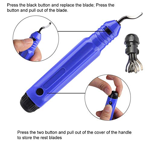 2. Premere a fondo il pulsante sulla fresa per sbavare per sostituire la lama, montare per installare.360 gradi ruotato, semplice e facile usando la lama raschiatrice per sbavare per voi! Lunghezza lama: 5 cm (1,96 pollici)