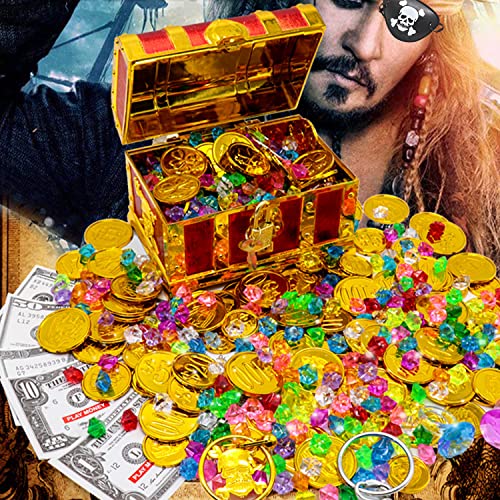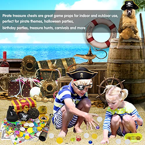Forziere Pirati, 100 Pezzi Gemme dei Pirati e 20 Pezzi Pirata Monete d'oro, Kit da Pirata per Bambini, Tesoro Monete d'oro, Telescopi, Bende sull'occhio, Bussola, Party Decorazione Pirata
