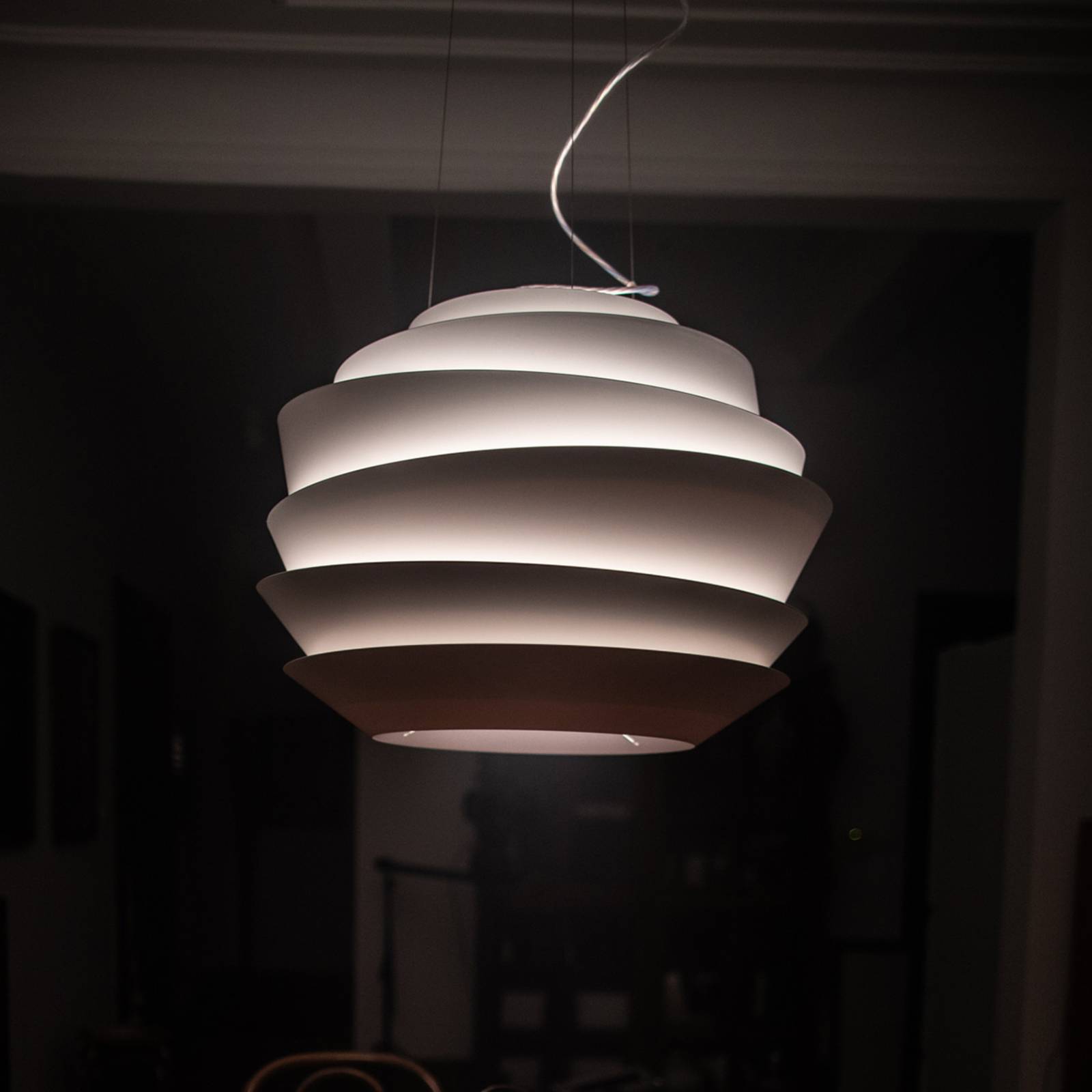 Foscarini Le Soleil - lampada a sospensione LED dimmerabile I suggestivi dinamismi di luce sono la specialità di Vicente García Jiménez, il designer che nel 2009 ha firmato la serie di lampade Le Soleil per l'azienda Foscarini. Ispirandosi all'architettura del Museo Guggenheim di New York, Jiménez ha progettato un corpo illuminante di fascino molto particolare. Il paralume è composto da sei anelli di policarbonato stampato a iniezione, diversi per diametro e taglio obliquo. Questi nastri non lasciano passare la luce dei LED ma la guidano abilmente attraverso le fessure, che essendo oblique creano una luminosità irregolare sulla superficie esterna. Inoltre la luce emessa si concentra anche sul piano sottostante diffondendo una luminosità efficace. I dinamici giochi di luci ed ombre, vagamente architettonici, sono il tratto distintivo della lampada Le Soleil che ne fa un colpo d'occhio ovunque la si appenda, non importa se per illuminare una zona o un intero ambiente. Predisponendo un dimmer esterno si possono personalizzare ulteriormente gli effetti di luce. Dopo aver studiato design industriale a Castellón de la Plana, Vicente García Jiménez ha lavorato a Barcellona per importanti produttori di illuminazione e mobilio prima di aprire il suo studio di design a Udine nel 2005. Le Soleil di Foscarini è uno dei suoi progetti più significativi.