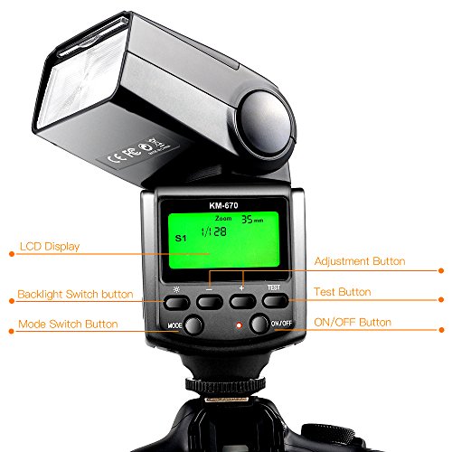 Potente flash manuale con display LCD, guida alta n. 38 (100/1 metri ISO), tempo di riciclo 2,8S, zoom 35mm, utilizzo in modalità flash trigger wireless manuale / S1 / S2. Flash non funziona in modalità TTL.