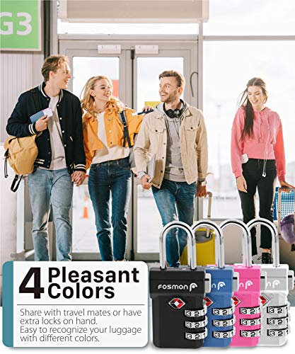 Fosmon Indicatore di avviso di apertura Lucchetto per bagagli combinato a 3 cifre accettatoTSA - Nero, blu, rosa e argento - 4 pezzi
