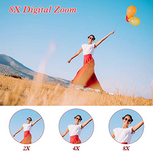 【Zoom digitale 8x】Questa fotocamera digitale dispone di uno zoom digitale 8x, che offre una visione fantastica del paesaggio a distanza. Il design compatto e leggero in formato tascabile rende facile portare questa fotocamera digitale ovunque. La nostra fotocamera digitale supporta schede SD fino a 128 GB (una scheda SD da 32 GB è inclusa). ).