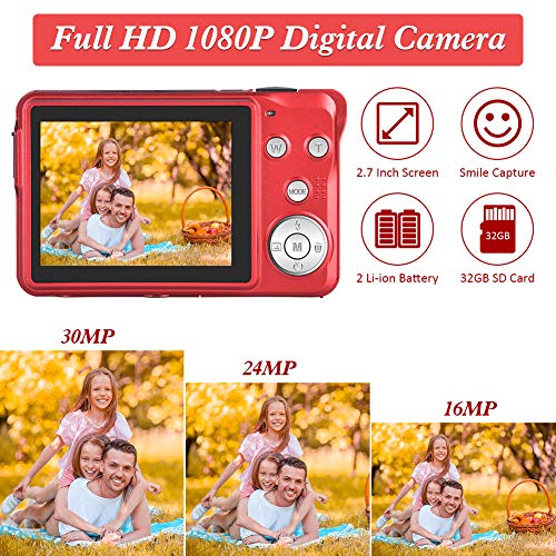Fotocamera digitale 30 MP 1080P fotocamera digitale compatta 8X Zoom digitale mini fotocamera LCD 2,7" (rosso)
