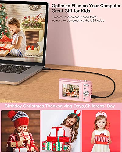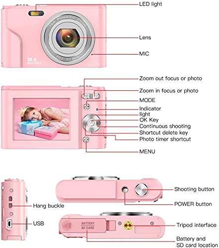 Fotocamera digitale 1080P FHD Mini Videocamera 36 MP LCD Ricaricabile Studenti, Fotocamera compatta con zoom digitale 16x, YouTube Vlogging Camera per bambini (pink)