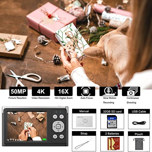 Fotocamera Digitale, Fotocamera Compatta da 50MP 4K Full HD, Fotocamera per Vlogging con Messa a Fuoco Automatica, Schermo Grande da 2,88 Pollici, Scheda SD da 32GB e Zoom 16x, per Bambini Adulti