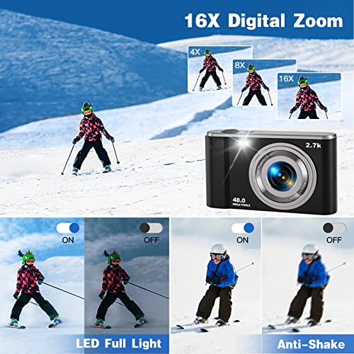 【Fotocamera Digitale Compatta con Zoom Digitale 16X e Flash LED】: Questa Macchine Fotografiche è dotata di uno Zoom Digitale 16X, puoi premere il pulsante W/T per ingrandire o rimpicciolire oggetti distanti e catturare tutti i dettagli di cui hai bisogno. Questa Fotocamera Compatta ha una Funzione Anti-Vibrazione, l'immagine video è più stabile e la luce di riempimento integrata ti aiuta a scattare foto di qualità al buio.