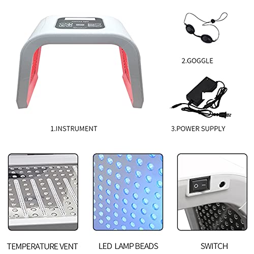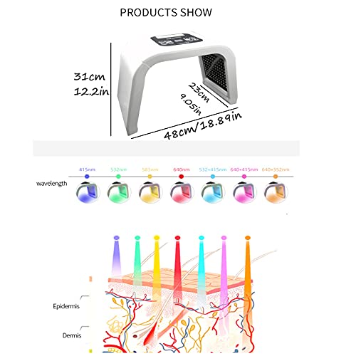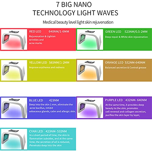 【7 FUNZIONI COLORI】 Luce rossa per stimolare la produzione di collagene. Luce blu per la rimozione e la prevenzione dell'acne. Luce verde per l'equilibrio del pigmento del colore, riduzione delle linee sottili, invecchiamento del nutriente della pelle. Luce gialla per migliorare lo scambio di ossigeno nelle cellule per reintegrare le cellule della pelle. Luce viola, doppia luce rossa e blu per la riparazione delle stampe acne. Luce blu chiara per un migliore metabolish cutaneo per migliorare