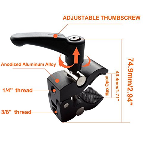 VERSATILE SUPER CLAMP- Il morsetto ha una femmina 1 / 4-20 e una 3 / 8-16, entrambe le misure di raccordo standard nell'industria photog per teste e treppiedi possono essere utilizzate per una varietà di attacchi. Questo braccio di articolazione magico è universale che può fissarsi su qualsiasi corpo sagomato come pacco batterie, torcia a led, monitor video, telecamere, luci, ombrelli, ganci, mensole, lastre di vetro, barre trasversali, ecc.