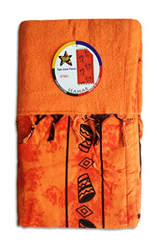 Telo Mare Fouta Pareo Doppio Etnico 90x170 cm con Frange 100% Cotone sopra 100% Spugna sotto (Arancione)