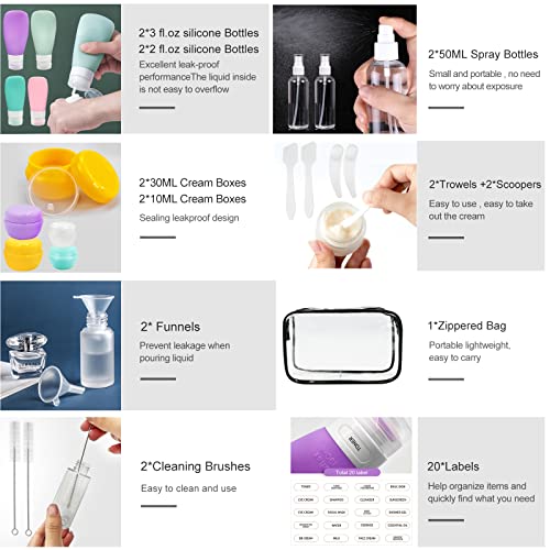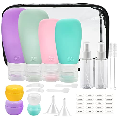 Compagno di viaggio: questo set di cortesia da viaggio include 4 flaconi in silicone (2 x 2 fl.OZ/ 60 ml + 2 x 3 fl.OZ/ 90 ml) per il risparmio di shampoo o detergente, 2 flaconi spray vuoti (60 ml) per profumi o idratanti, 4 vasetti per crema idratante, 2 imbuti, 2 spine. atole, 2 scoop, 2 spazzole per la pulizia, 1 etichetta e 1 sacchetto in PVC.