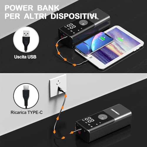 【Batteria da 6000 mAh e doppia alimentazione】 Compressore Aria Portatile due diverse opzioni di alimentazione, una batteria agli ioni di litio da 6000 mAh, che offre 40 minuti di funzionamento continuo. Nel caso la batteria si esaurisca, puoi anche collegarlo alla presa accendisigari a 12V della tua auto per gonfiare gli pneumatici. anche fungere da alimentatore di emergenza per il tuo telefono cellulare o altri dispositivi digitali.
