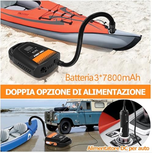 【Batteria e accendisigari Alimentazione elettrica】Pompa Elettrica SUP ha una batteria di super capacità 3*7800mAh, quindi non devi parcheggiare l'auto sulla spiaggia o preoccuparti di non essere in grado di gonfiare il kayak su un'isola disabitata. Può anche aiutare a salvare gli altri dispositivi che fuoriescono aria nell'acqua. Naturalmente, se la batteria è scarica, è anche possibile collegare l'accendisigari dell'auto per un uso immediato.