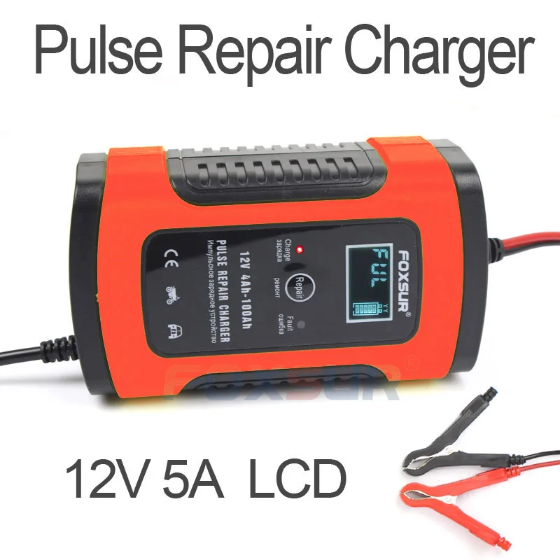 FOXSUR 12V 5A Pulse Repair Charger with LCD Display, Motorcycle & Car Battery Charger, 12V AGM GEL WET Lead Acid Battery Charger