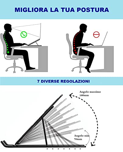 COMODO ED ERGONOMICO questo rialzo per pc portatile offre un'ampia scelta di regolazioni, ben 7 inclinazioni diverse, per garantire una migliore ergonomia della tua postazione di studio o lavoro. E' di grande aiuto nel prevenire una postura scorretta e quindi i vari dolori alla schiena, al collo e alle spalle.