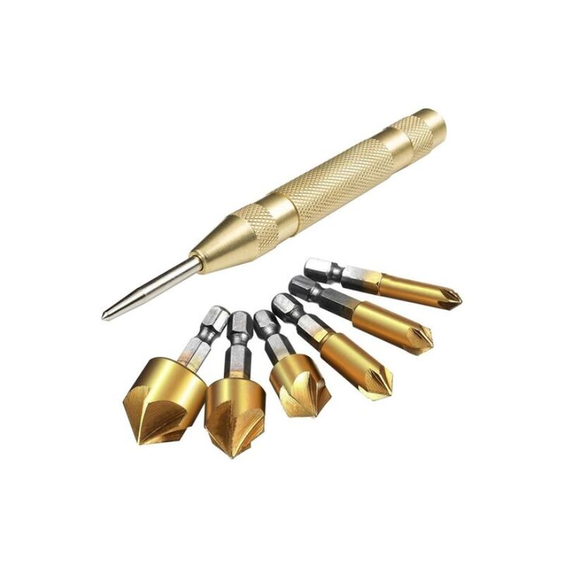 Nome: Five Blade Chamfing Device Peso del prodotto: 122 grammi Materiale: acciaio al carbonio alto (usato principalmente nell'industria del legno) Trattamento superficiale: impiallacciatura in titanio, utilizzata per la prevenzione della ruggine, più bella, aumentando la durezza del Surface Configurazione del prodotto: Set di sei pezzi da 6 a 19 mm (6,8,9.12.16.19 mm ciascuno) + guscio di infusione centrale, peso 210g Uso: Molto adatto per la rientranza dei fori di fissaggio in legno o plastica. Materiale: Queste fragole sono realizzate in acciaio veloce e titanio resistente alla corrosione rivestito, che funziona anche nei materiali più difficili. Sostituzione rapida: la maniglia esagonale da 64 mm può essere caricata rapidamente. Non scorrere nel mandrino. Quantità di consegna: 1 * Set / Li>