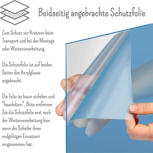 IMPORTANTE: la lastra di vetro acrilico infrangibile e altamente antiriflesso è rivestita su entrambi i lati con una pellicola protettiva antigraffio e per il trasporto - ricordarsi di rimuovere la pellicola su entrambi i lati dopo il trasporto!