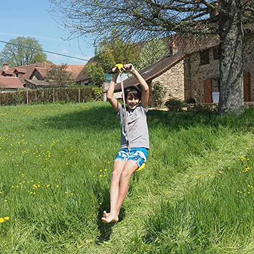 Il kit tirolese si compone di: una puleggia gialla con maniglie grippate, un sedile giallo regolabile, un sistema di frenata lungo 1,60 m e tutto il necessario per l'installazione (cavi, serre cavi, ecc.)