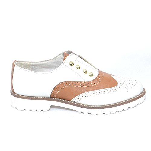Francesina Donna in Vera Pelle Bicolore Bianco e Cuoio con Chiusura ad Elastico Borchiato (39 EU)
