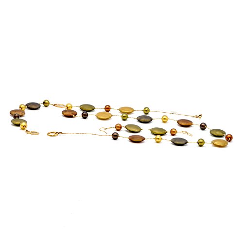 Parure in oro con il collare, il bracciale e gli orecchini perle in vetro ovali di 22 mm Oro e marrone, verde con inclusione di foglie d' oro separate per le perle rotonde da 10 mm Oro e marrone. Il filo è composto di paillettes d' oro creuses. materiali ipoallergenici