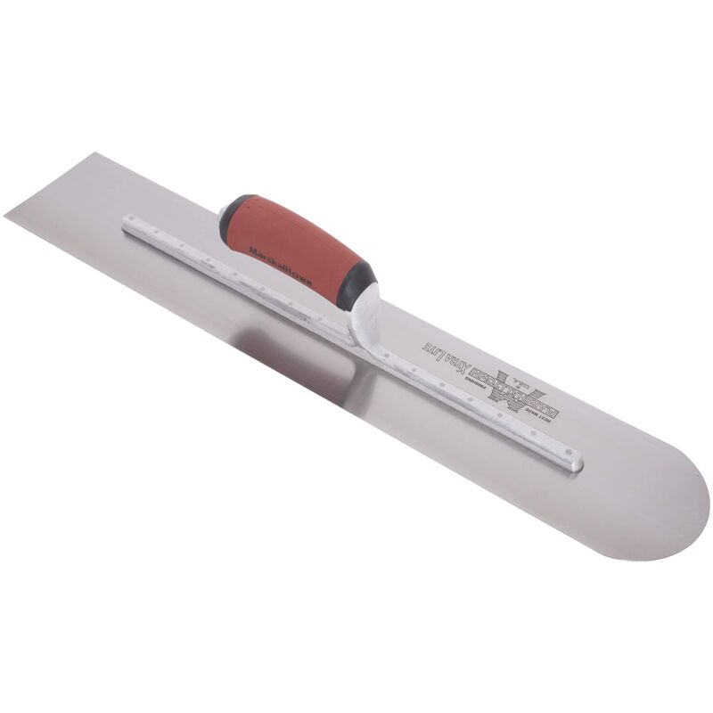La spatola lisciante di Marshalltown è realizzata in acciaio al carbonio di alta qualità, la parte anteriore della spatola è arrotondata, la parte posteriore è quadrata, in modo da avere l'utensile giusto ovunque. La lama in acciaio al carbonio è saldamente fissata al supporto in alluminio fuso, che ha un albero quadrato per evitare che la spatola ruoti. Va sottolineato che il primo rivetto nella parte anteriore è molto più spesso degli altri, perché è lì che avviene la maggior parte del carico. L'impugnatura curva brevettata Durasoft è saldamente fissata al supporto/supporto. La sua forma ergonomica riduce i segni della fatica e offre un maggiore comfort durante il lavoro. Questo permette all'artigiano di lavorare tutto il giorno senza che le mani gli facciano male. Il manico è sostituibile, il che non è una cosa scontata per gli strumenti, si può scegliere tra manico Durasoft, manico in legno e manico in pelle.