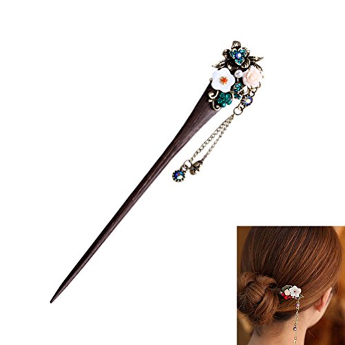 Frcolor Spillone capelli legno Bastone capelli annata Forcine pin retro con cristallo e nappa (blu)