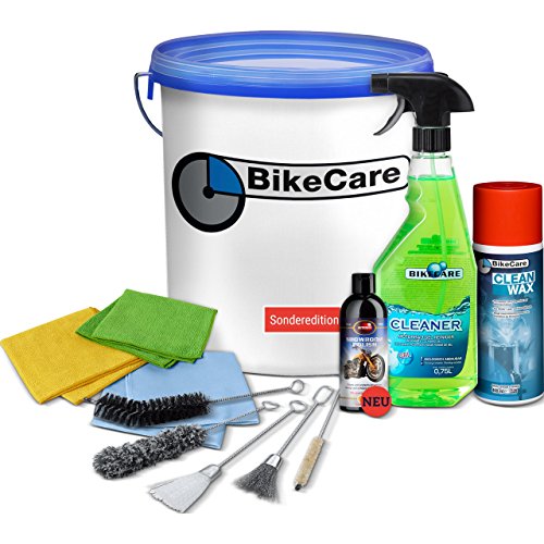 Bike Care Frecce Set per la cura, cura di Set di benna, 12 pezzi, Cleaner gel Frecce Detergente Spray bottiglia, set di spazzole, Clean Wax, Set di panni in microfibra, Autosol Show Room Polish, Secchio da 10 litri