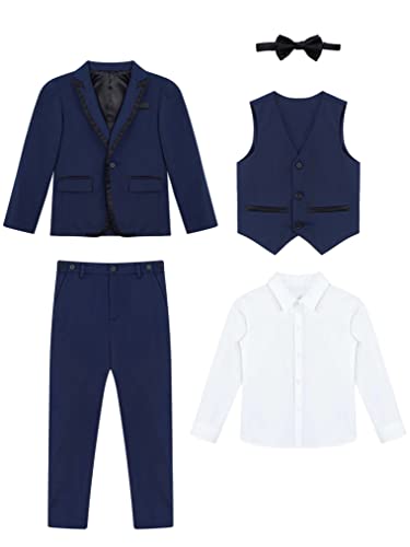 Freebily Completo Bambini Set di 5 Pezzi Camicia Bianca + Gilet + Blazer + Papillon + Pantaloni Gentleman Suit Smoking Nozze Battesimo Matrimonio Sposa Festa Compleanno Blu Scuro 4 Anni