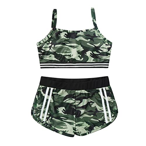 Freebily Tuta da Danza Classica Bambina Completo Sportivo 2 Pezzi Stringer Tank Top Palestra Leggings Corti Stampa Floreale Body Ginnastica Artistica per Ragazza Camouflage 5-6 Anni