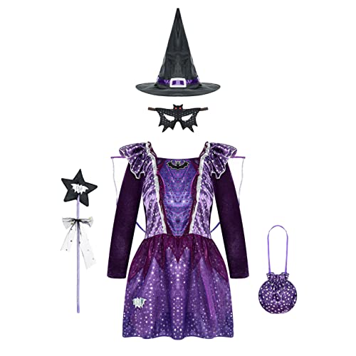 Freebily Streghetta Carnevale Bimba Costume da Strega Vampiro Ragno Vestito Medievale da Cerimonia Cappello a Punta Bacchetta Magica Stella Borsa Caramelle Halloween Viola 2-3 anni