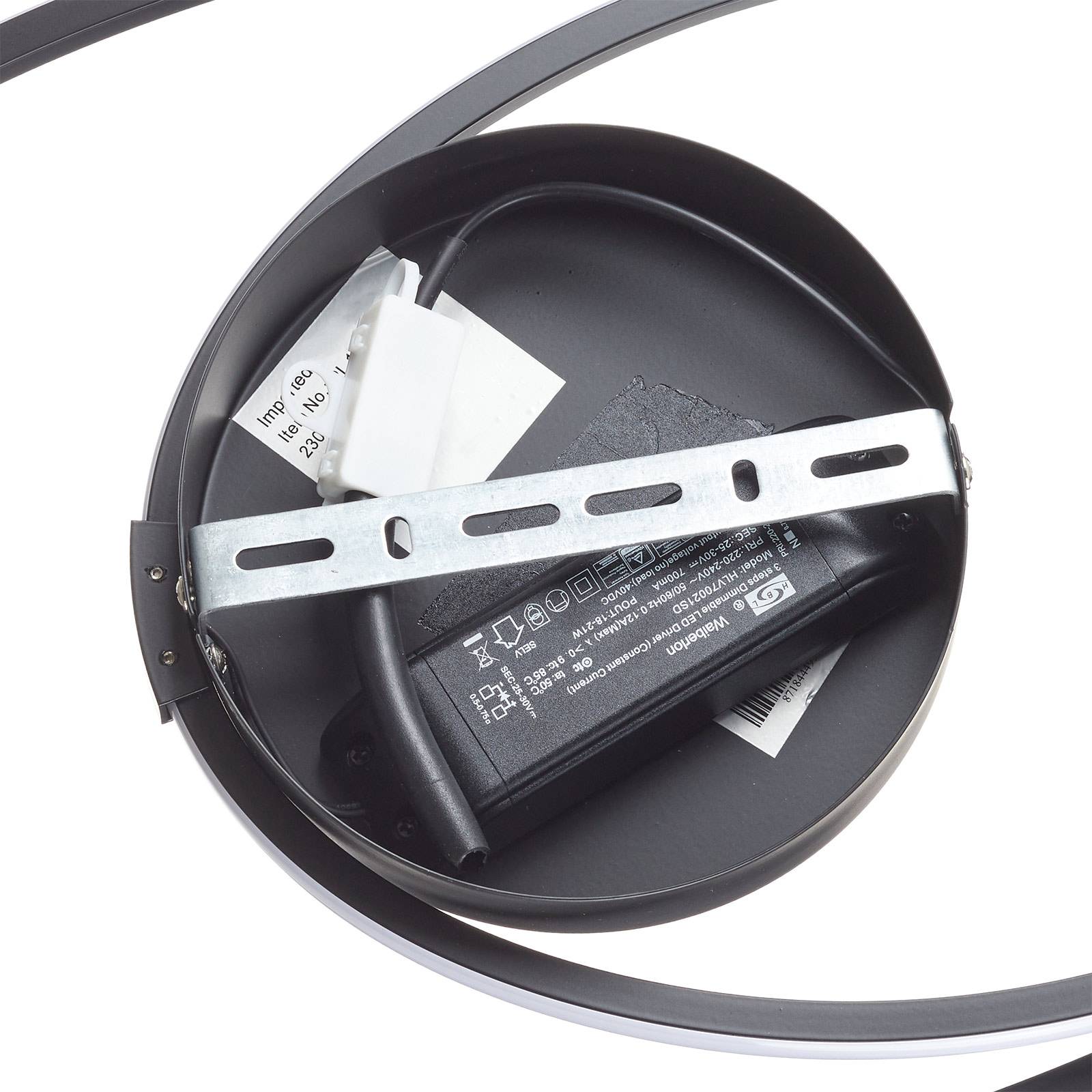 Plafoniera LED Ophelia - anulare e moderna Da un rosone sferico nasce una struttura ondulata con due anelli. All'esterno degli anelli sono incorporate strisce di plastica continua, dietro le quali si nascondono i LED. La loro luce bianco caldo garantisce un'illuminazione piacevole. In combinazione con l'aspetto contemporaneo, Ophelia è la plafoniera idonea per ambienti in stile moderno. - Dimmerabile a 3 livelli tramite interruttore a parete