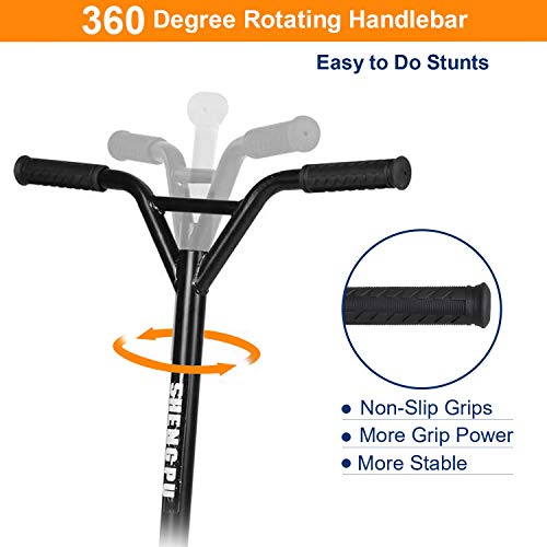 【360 ° Pro Scooter】 Il manubrio flessibile, che può essere ruotato a 360 gradi, facilita le cascate impressionanti. I manici in gomma antiscivolo offrono una presa morbida e confortevole durante lo scivolamento. Il nostro monopattino Pro è conforme alla norma europea EN14619. Un'ottima scelta per i principianti o gli scooter freestyle professionisti.