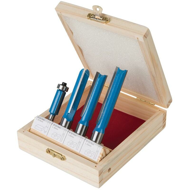 Set completo per il montaggio di cucine. Lame taglienti TCT. Solido codolo in acciaio indurito. Custodia in legno. Include 1 x fresa dritta 63 x 12,7 mm con codolo da 12 mm, 2 x frese dritte 50 x 12,7 mm con codolo da 12 mm;
