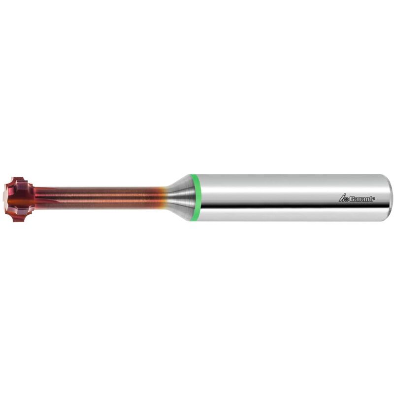 DescrizioneEsecuzione:Codolo extralungo.Testa doppiamente rettificata con doppio angolo.Tolleranza: Dim. = raggio r ± 0,05 mm.Uso:Per l'impiego universale su quasi tutti i tipi di materiali. Il rivestimento di nuova concezione impedisce la formazione del tagliente di riporto con un'efficacia straordinaria, anche su alluminio e INOX.Per la sbavatura a spinta e in tiro di bordi.Dati tecnici Raggio r 1,5 mm Rivestimento TiAlN Materiale da taglio HMI Norma Norma interna Modello N Tolleranza contorno del raggio ±0,05 Numero denti Z 5 Larghezza di fresatura ae per operazioni di fresatura 0,5×r per contornatura Codolo DIN 6535 HA con h6 Passaggio interno per LR no ⌀ minimo D3 7 mm ⌀ massimo D2 10 mm L2 +0,5 5 mm ⌀ D1 +0,05 6 mm L4 +0,5 31 mm Lunghezza taglienti Lc 1,5 mm Lunghezza complessiva L 100 mm ⌀ codolo Ds 10 mm Fresatura a raggio avanti e indietro Avanzamento fz per contornatura in acciaio < 900 N/mm2 0,01 mm Tolleranza codolo h6 Colore collarino verde Tipo di prodotto Frese a codolo