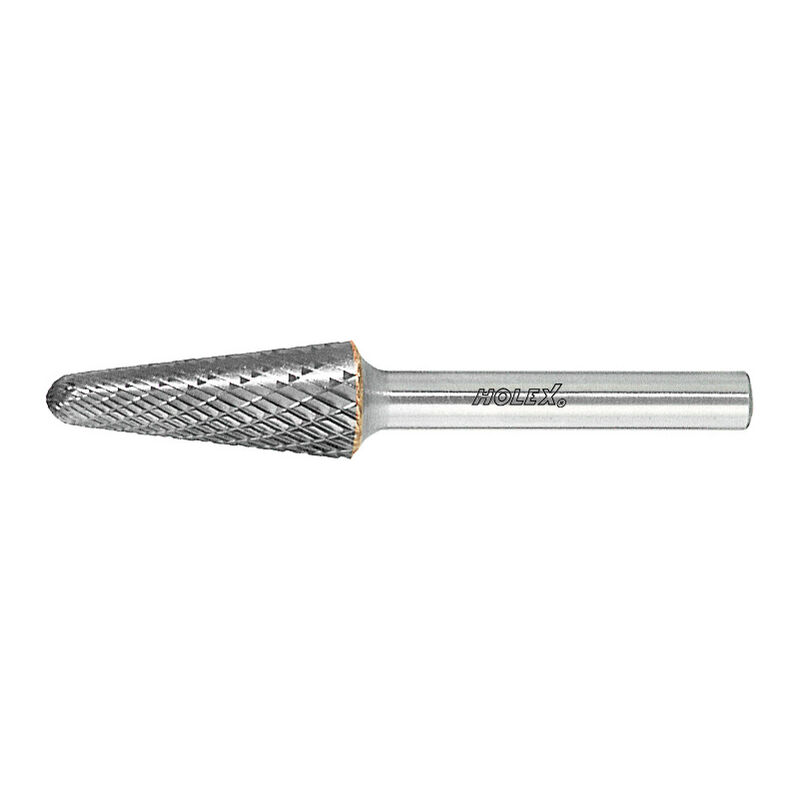 ⌀ codolo 6 mm. HOLEX − Le frese rotative sono realizzate con metalli duri in alta qualità particolarmente tenaci e con taglienti molto stabili, esclusivamente con moderne macchine CNC. Il gambo è in acciaio se il diametro della testa è maggiore di quello del gambo. In caso contrario anche il gambo è in metallo duro. Forma conica tonda (KEL). Uso: Sia per l'utilizzo manuale sia per l'utilizzo industriale robotizzato con quasi tutti i materiali. Per lavori di sbavatura, smussatura bordi, intonacatura, nonché per lavorazioni sui punti di saldatura e sulle superfici. Dati tecnici GG(G) m/s idoneo Acciaio < 60 HRC m/s idoneo Uni m/s idoneo Acciaio < 55 HRC m/s idoneo Acciaio < 900 N/mm² m/s idoneo Acciaio < 1400 N/mm² m/s idoneo Materiale da taglio HM INOX m/s limitatamente adatto Ti m/s limitatamente adatto Tipo di prodotto Fresa rotativa ⌀ Testa, mm 10 Lunghezza della testina, mm 20 Lunghezza complessiva, mm 65 ⌀ Gambo, mm 6 della forma Conica tonda Sigla della dentatura Z7 Tipo di