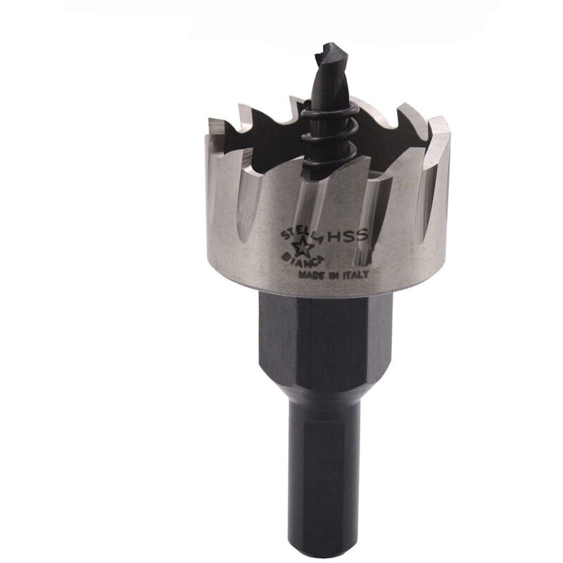 Fresa a tazza HSS STELLA BIANCA Completa di gambo e punta guida per la foratura dei metalliCon scarico lateraleAcciaio super rapido speciale HSS CARATTERISTICHE: Diametro della fresa: 27 - 28 - 29 - 30 - 31 - 32 mm Altezza utile di taglio: 8 mm Profondità utile: 10 mm Profilo totalmente riaffilabileMolla per l'espulsione del dischetto di risulta (per tazze Ø≥25mm)Attacco sfaccettato per non scivolare nel mandrino (con Ø tazza >18 mm)Attacco cilindrico (con Ø tazza