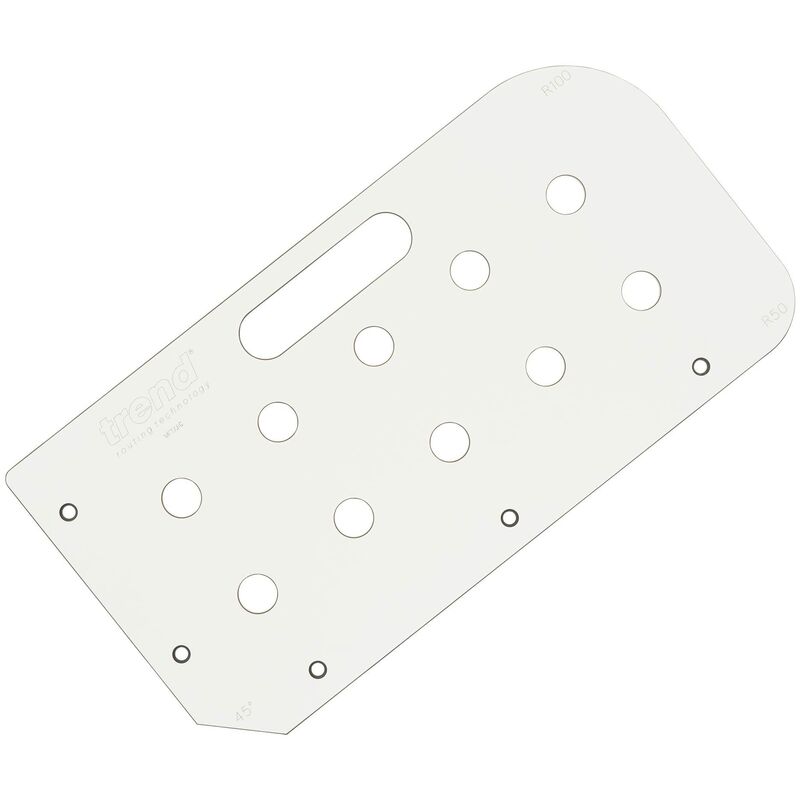 Maschera multifunzionale per realizzare piani di lavoro precisi e precisi in stile MFT con un router a tuffo. Per fori da 20 mm a 96 mm. Realizzato in laminato compatto ad alta pressione con spessore di 12 mm. Due raggi angolari e taglio finale a 45 gradi. Guide per bordi per righe iniziali, perni di indice per indicizzazione per fori successivi. dy.|Maschera Richiede: |Un router portatile a immersione con capacità di gambo di 12,7 mm (1/2) e minimo 1300 watt. | Una bussola guida modello con 30 mm di diametro esterno ref. GB30/A.|Una lunga serie TCT taglio fresa a immersione con diametro di 20 mm e lunghezza di taglio di 37 mm. Due morsetti. Centri del foro = 96 mm. Raggio = 50 mm e 100 mm. Taglio finale = 45 gradi. Dimensioni = 298 mm x 586 mm. Peso = 3 kg. | Boccola guida = mm. router ge = 1 /2 | Taglierina = 20 mm x 37 mm taglio con taglio a tuffo | Morsetti = Due