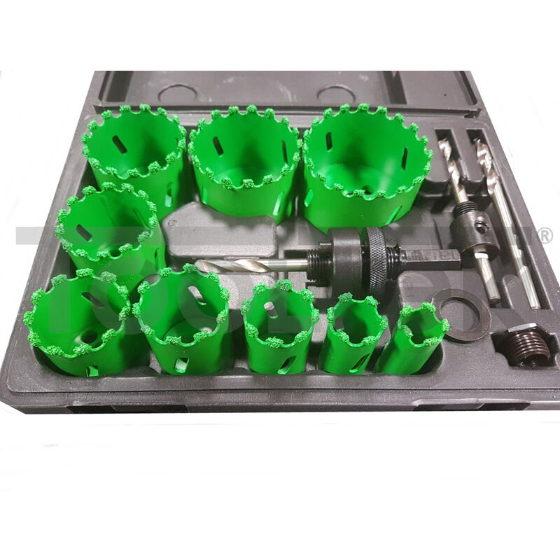 Set di frese composto da 13 pezzi .Ideali per ceramica, piastrelle, muri, cemento, pietra e altri materiali.IN DOTAZIONE: 9 FRESE: 19 - 22 - 29 - 35 - 38 - 44 - 51 - 57 - 64mm 2 ALBERINI PORTAFRESE 1 RIDUTTORE 1 PUNTA GUIDA da 10 cm .