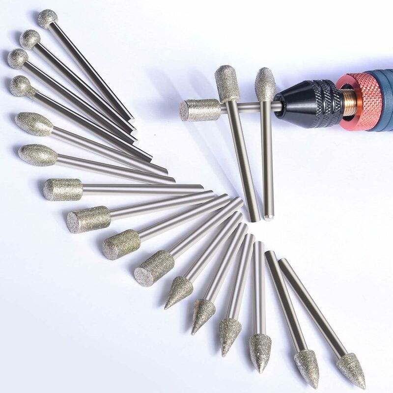 Lima rotante con testa diamantata, adatta per vetro, metallo, pietra, ceramica, giada, gioielli, legno, plastica e altri materiali duri. 2. Varie forme: i kit di lucidatura hanno 6 testine diverse utilizzate per varie applicazioni che soddisfano diverse Altamente raccomandato per intaglio e taglio di vetro, pietra e ceramica, incisione per hobby, modellismo artigianale, riparazioni domestiche (legno, plastica e chiodi per cani), ecc. < p>3. Gambo universale - Tutte le frese diamantate con gambo da 1/8" e le punte montate sono compatibili con la maggior parte degli utensili rotanti e delle smerigliatrici. 4. Robusta scatola di immagazzinaggio - 20 pezzi di testine di levigatura confezionate in una robusta scatola di plastica, resistente alle cadute s e umidità, facile da trasportare e riporre, ben organizzato per evitare dispersione