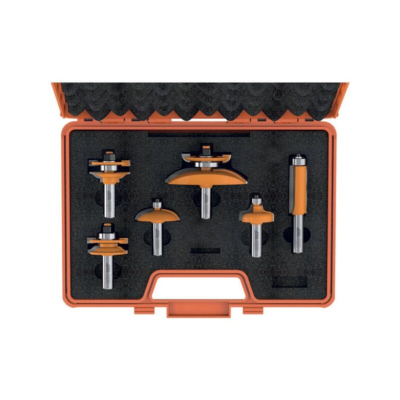 SET 6 FRESE PROFILATE X CUCINA HW S=12.7 (dis.B) DX Il nuovo set per cucina presenta 6 frese espressamente concepite per realizzare antine con profili ad arco e cassetti sagomati di alta qualità. Il set include: SET DI FRESE PER INCASTRI MASCHIO E FEMMINA: due utensili perfettamente corrispondenti. FRESA PER ANTINE CON CONTROPROFILO: utensile con Ø89mm che unisce due profili in uno. FRESA PER RIFILARE C/CUSCINETTO: D=Ø19mm per una voluminosa esportazione di materiale. FRESA PROFILATA C/CUSCINETTO: per realizzare modanature e profili sul margine dei battenti. FRESA DOPPIO RAGGIO CONVESSO:: per realizzare finiture sulla parte alta esterna dei cassetti.