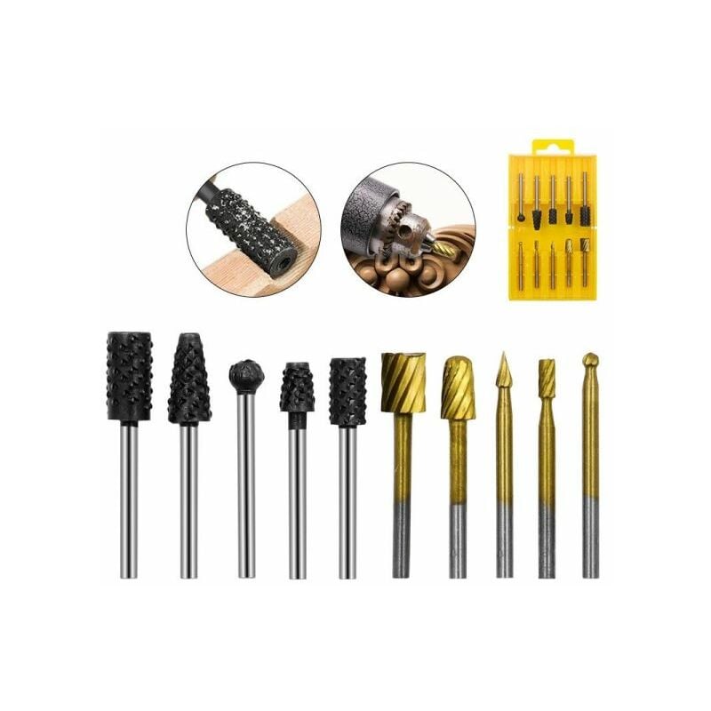 Set 10 mini frese raspe in acciaio per lavorazione rifinitura legno codolo 3mm 10 pezzi di lima rotante fresa per la lavorazione del legno (5 pezzi di nero + 5 pezzi di dorate) Materiale: acciaio ad alta velocità Diametro gambo testa: 3mm Pacchetto/specifica: 10 pezzi in scatola di plastica gialla (120mm x 72mm) È adatto per incisione, smussatura, scanalatura, alesatura, levigatura e molatura di legno, plastica, resina e altri materiali morbidi. contenuto della confezione 10 pezze frese rotanti