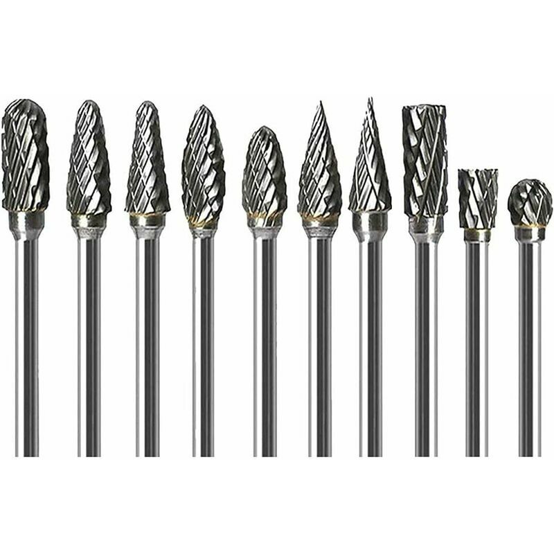 10 frese rotanti: nel kit sono inclusi 10 diversi pezzi di frese rotanti da 3 mm: frese a cono, frese a forma di V, cilindriche ecc. Il diametro del gambo è di 3 mm. Il diametro di taglio è di 6 mm. Queste dieci diverse forme e dimensioni di fresa soddisferanno pienamente le tue esigenze, semplificando la lavorazione del materiale. Materiale in tungsteno: questa punta è realizzata in acciaio al tungsteno di alta qualità, resistente e di lunga durata. può resistere alle alte temperature. Quindi la superba qualità della taglierina rotante migliorerà completamente la tua efficienza nella lucidatura degli oggetti. Multiuso: questo kit di punte da trapano non è adatto solo per materiali metallici come ghisa, acciaio, acciaio per cuscinetti, acciaio ad alta acciaio al carbonio, nichel-cromo, bronzo, ottone, ma adatto per materiali non metallici come legno, plastica, piastrelle, marmo, giada, osso, ecc. Questo lo rende ideale per i tuoi lavori di incisione o finitura. Applicabilità: il