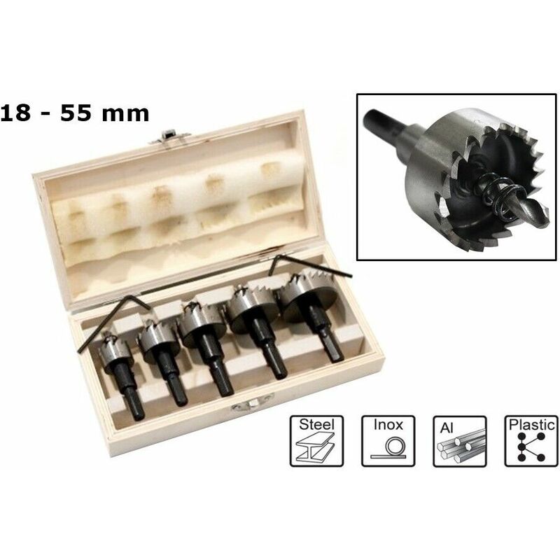 SET 5 FRESE A TAZZA INACCIAIO HSS PER METALLO.SET DI 5 FRESE A TAZZA IN ACCIAIORAPIDO HSS PER FORARE METALLI( ACCIAIO, ALLUMINIO, FERRO ) E MATERIALI PLASTICI.DOTATE DI PUNTA DI CENTRAGGIO EMOLLA DI ESPULSIONE DEL PEZZOTAGLIATO.MISURE:18 - 30 - 32 - 35 - 55 mmALTEZZA DI TAGLIO UTILE 10 mmIL TUTTO IN PRATICA VALIGIETTADI LEGNO.