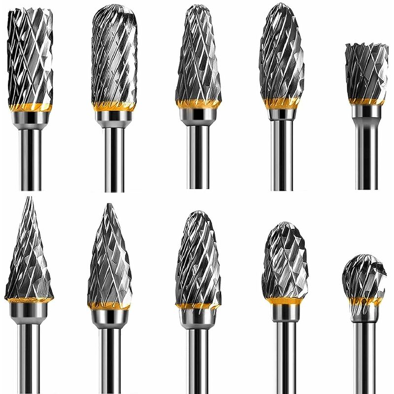 Set di frese rotanti a doppio bordo in metallo duro integrale da 10 pezzi compatibile con la maggior parte dei piccoli utensili rotanti. Scelta eccellente per fai da te, artigianato, hobby, riparazioni domestiche, gioielli, uso lapidario, modellismo e molto altro. Set di 10 frese in carburo di tungsteno - punte per intaglio del legno, testina abrasiva per legno, plastica, ceramica e ceramica di giada, intaglio della pietra, lavorazione dei metalli e dell'acciaio. Accessori per utensili rotanti, adatti per forare, intagliare metalli, incidere, lucidare. Set di frese in metallo duro in acciaio al carburo di alta qualità trattato termicamente al tungsteno per una maggiore durata, estremamente duro, resistente, durevole e resiliente. HRA ≥ 85 Durezza di lavorazione che raggiunge HRC70. Per la maggior parte dei lavori, il kit di frese rotative può sostituire efficacemente la rotella Petiole. Il set di frese rotanti in metallo duro può lavorare una varietà di cavità dello stampo elevate.
