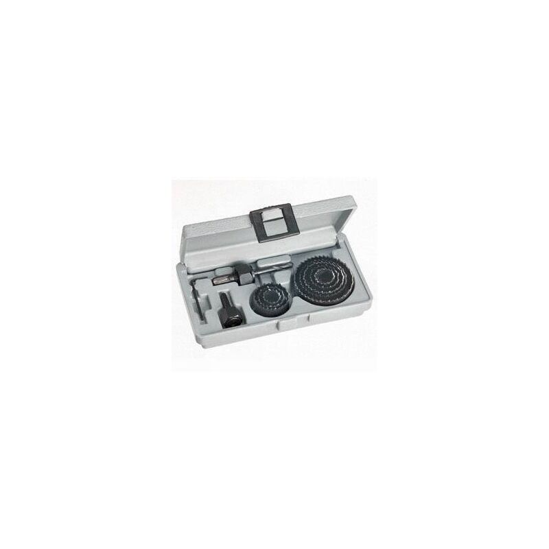 Per forare legno, plastica, cartongesso. 8 tazze a corpo unico in acciaio brunito per fori è19, è22, è29, è32, è38, è44, è51, è64mm, profondit è di taglio 24mm, 1 albero con punta per centrare, 1 mandrino, 1 chiave.
